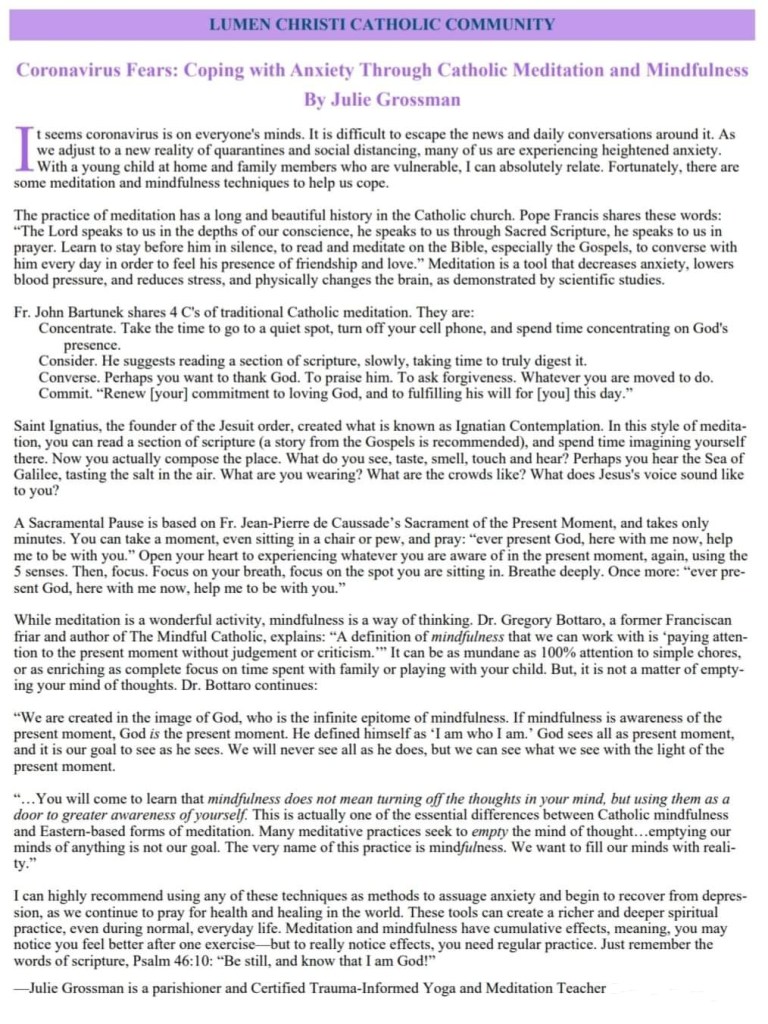 Catholic Meditation and Mindfulness Posted byJulieJuly 2, 2024July 2, 2024Posted inCatholic Meditation, Catholic Mindfulness Share this: Click to share on X (Opens in new window) X Click to share on Facebook (Opens in new window) Facebook Like Loading... Related