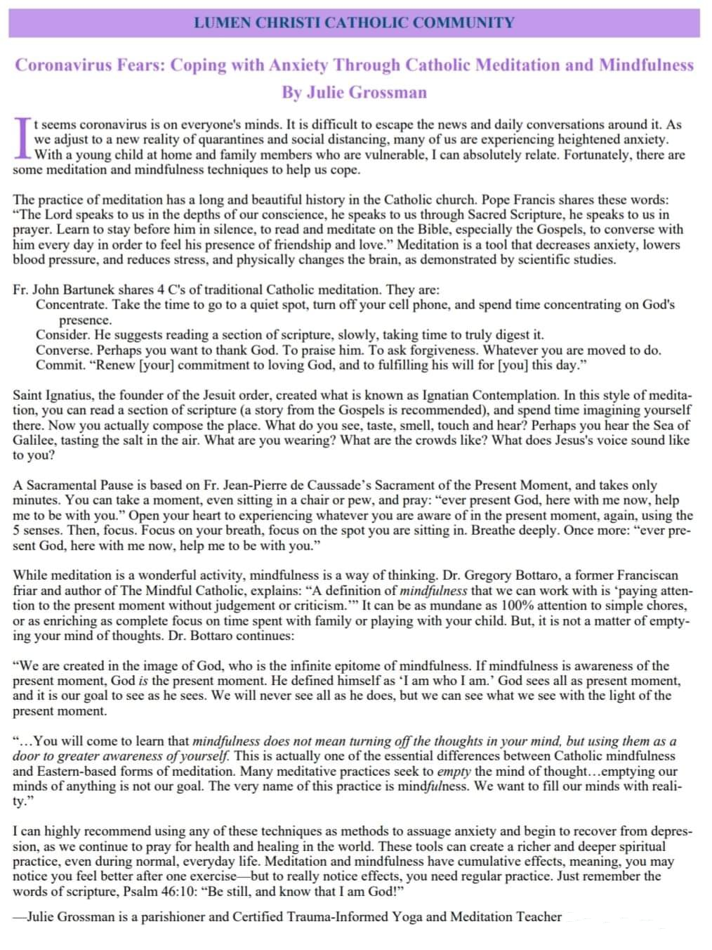 What is mindfulness? While meditation is a distinct spiritual exercise, the practice of mindfulness can be harder to pinpoint. Dr. Gregory Bottaro defines it in his book, The Mindful Catholic: “A definition of mindfulness that we can work with is “paying attention to the present moment without judgement or criticism.” He goes on to write, “We are created in the imageContinue reading "Mindfulness"